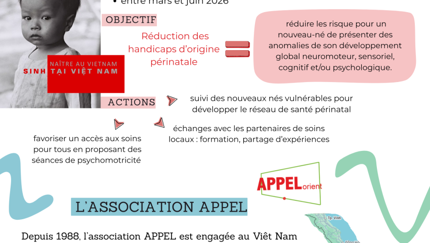 L’association APPEL œuvre depuis 1994 dans la protection et la promotion de la mère et de l’enfant. Elle agit pour la réduction des handicaps d’origine périnatale à travers des actions de prévention, de dépistage et de prise en soin d’enfants en situations de vulnérabilité. L’association permet la mise en place d'actions de terrain (missions médicales au Viêt Nam, stages en Bretagne, équipement de structures sanitaires…) et de travaux de recherche en médecine périnatale.