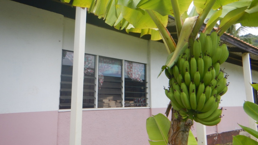 Pour planter le décor, on trouve des arbres à pain, des bananiers et d’autres arbres tropicaux dans la cour. La cour est une grande étendue de pelouse avec pas mal de fleurs de-ci de-là. En arrière-plan, on distingue les montagnes de Moorea. Le cadre est calme et apaisant, pas de bruit de voiture aux alentours. Les bâtiments de l’école ne sont pas neufs, mais ils sont tout de même en bon état. Par contre nous constatons que la cantine est toute neuve.