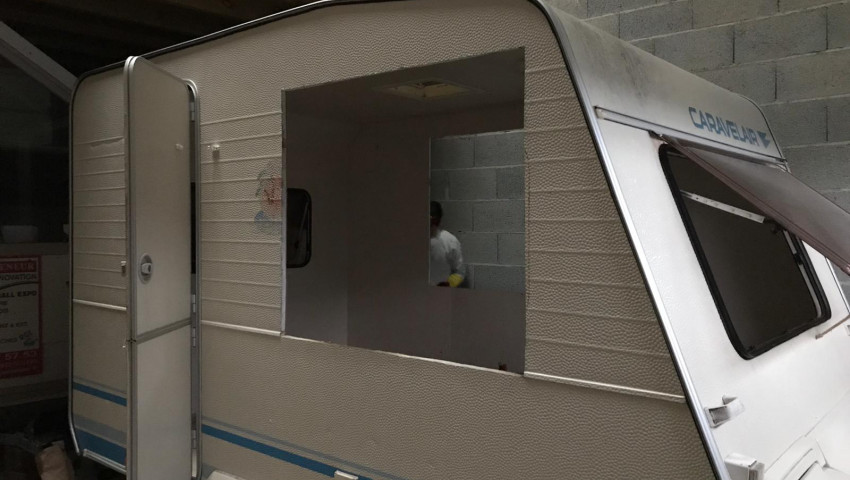 Nous avons découpé deux côtés de la caravane afin de créer des ouvertures.